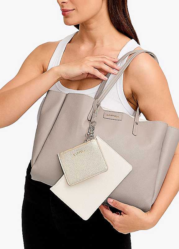 The freya triple compartment tote features a taupe exterior with gold tone branding. There are two, removable zipped pouches on the front.2 magnetic closures and one interior zipped compartmentCan fit phones up to 7 inchesSyntheticSize approx. 26H x 37L x 10D cmStrap length shoulder: 51 cmStrap drop: 23 cm