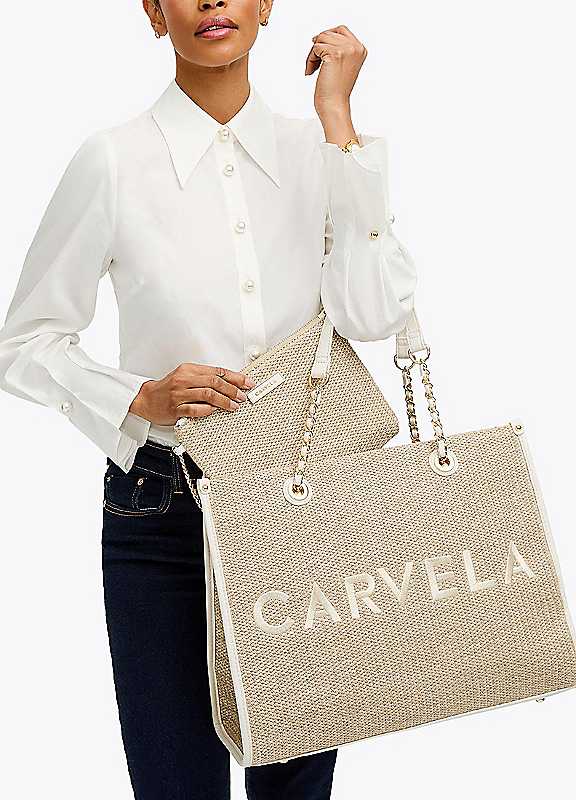 This sorrento raffia tote bag features a woven exterior with stitched carvela branding on the front. Each shoulder strap is accented with gold chain. There is a removable woven pouch to take from day to night.Four gold feetCan fit laptops up to 14 inchesOtherSize approx. 33H x 42L x 14D cnStrap length: 55 cm