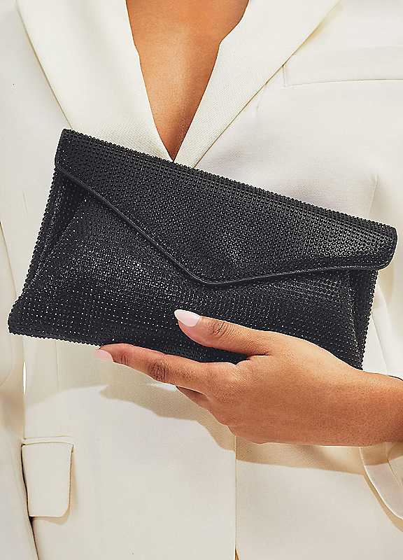 The stargaze envelope clutch bag features a black exterior with crystal embellishment across the exterior. There is black metal branding on the back.Removable chain strapSyntheticSize approx. 14H x 23L x 2D cmStrap length: 109 cmStrap drop: 50 cmDue to the nature of the embellishments and style of chain on this bag, please take care when wearing close to clothing.