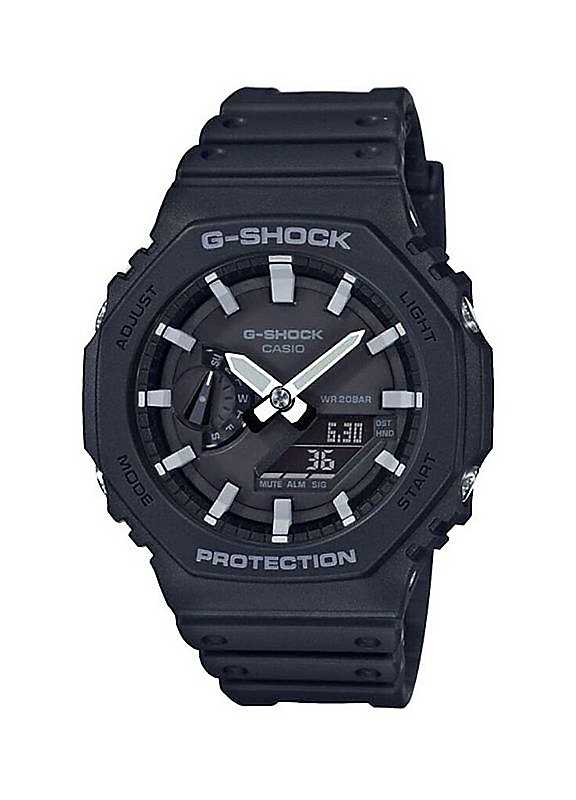 This sleek black and grey piece embeds the latest carbon core guard technology in a slimmer more refined case. Taking inspiration from the 1983 original model, the DW-5000C, this watch gives homage to the much-loved retro look with its unique octagonal bezel, framing an analogue-digital display. As with the GA-2000, the GA-2100 has an interchangeable resin strap for customisation with any outfit or occasion. Despite its deceptively compact design, this watch is as durable and tough as any G-SHOCK on offer with 200-meter water resistance and shock resistance. Don't miss out on this eye-catching piece. 200 Metres Water Resistant 5 Daily Alarms: Each will sound every day at the time you set, Hourly time signal. The watch beeps every hour on the hour Once set, the automatic calendar always displays the correct date Battery life approximately 3 years Countdown Range: 24 hours Measuring Unit: 1 second The current date and week day are displayed on the watch face Shock Resistant Patented Hollow Core Guard Structure protects against impact & vibration Dual Illuminator: Separate illumination of the analogue and digital components ensures optimum readability in low light conditions Selectable illumination duration (1.5 seconds or 3 seconds), With afterglow, Simultaneous display of the current time in two different time zones Dimensions approx. 48.5 x 45.4 x 11.8 mm | black analog watch, water resistant watch, watch strap buckle, casual black watch, black strap watch, dual time watch, hybrid watch, carbon fiber watch