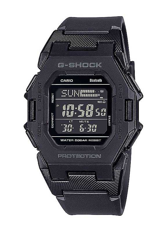 Even this small, it comes equipped with Bluetooth wireless connectivity and a step tracker so that you can easily take control of your daily exercise. Boasting a minimalist design with a futuristic finish the watch is inspired by our similar digital watches from the 1980s. With a case measuring just 46.3 mm in diameter and 11.0 mm slim, this G-SHOCK is significantly smaller than past models with the same shock and durable resistance you expect from any G-SHOCK watch. 12/24 Hour Format- Digital time display can be configured to either 12-Hour or 24 Hour FormatWater Resistant- 200 Metres Water ResistantAccuracy- +/- 15 seconds per monthAlarm Function- 5 Daily Alarms: Each will sound every day at the time you setAuto Calendar- Once set, the automatic calendar always displays the correct dateBand Material- ResinBattery Life- Approximately 2 yearsBluetooth® Connectivity- The watch can be wirelessly connected to a compatible smartphone or tablet via Bluetooth. The energy-saving technology enables access to a host of functionsConnect via the brand new CASIO WATCHES AppCountdown Timer Function- Countdown Range: 60 minutes, Measuring Unit: 1 secondDate and Weekday Display- The current date and week day are displayed on the watch faceDate Display- The current date is displayed on the watch faceDisplay Illumination- LED lightMineral Glass- Hard glass resists scratchingMute Function- The button tones on the mode button can be switched off for discreet operation. Pre-set alarm or timer functions remain activeStep Counter- Step count using a 3-axis acceleration sensor: 0 to 999,999 step count display rangeStep Count History Display: Daily data (8 days)Step Goal Progress Display (step count goal setting range: 1,000 to 50,000, 1,000-step increments)Step Count Graph: HourStopwatch Function- Measuring Capacity: 24 hours, Measuring Unit: 1/100th second | square watch, chronograph watch, casual watch, water resistant digital, smart watch, alarm watch, mineral glass watch, watch counts steps, black digital watch, lcd watch, resin band watch