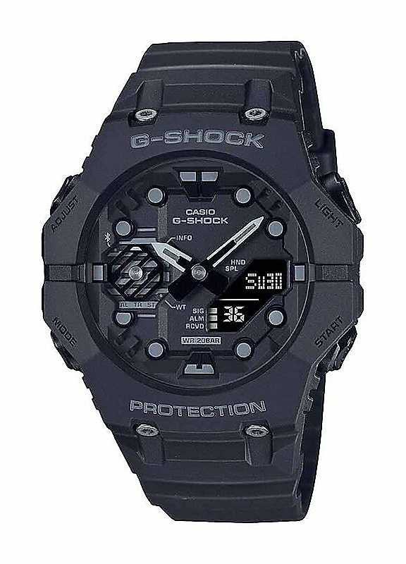 Introducing the new GA-B001 series from G-SHOCK -Featuring a new toughness-driven design and Smartphone Link functionality. With the GA-B001 and GA-B001G, Casio brings ingenuity to the exterior structure to achieve an integrated bezel and band construction in a shock-resistant watch that comprises two separate components that connect at the 9 and 3 o'clock positions. The moulded construction follows the lines of the wrist, minimizing the space between the wrist and the watch for an enhanced fit. These watches are all equipped with a Mobile Link feature for pairing with a smartphone via Bluetooth®. When used with the dedicated CASIO WATCHES app, the watch automatically adjusts to the correct time. In addition, the App information function sends notifications on the watch when the app receives updates on new products and other information. The GA-B001-1AER features the black G-SHOCK brand colour giving it a familiar yet new finish. Digital time display can be configured to either 12-Hour or 24 Hour format 200 Metres water resistant 5 Daily Alarms: Each will sound every day at the time you set, Hourly time signal: The watch beeps every hour on the hour Once set, the automatic calendar always displays the correct date Battery life, approximately 2 years Bluetooth Connectivity- Auto time adjustment, Easy watch setting, Approximately 300 world time cities, Time & place and Phone finder using the CASIO CONNECTED APP, Connect via the brand new CASIO WATCHES App Countdown Range: 24 hours, Measuring Unit: 1 second The current date and week day are displayed on the watch face Dual Illuminator: Separate illumination of the analogue & digital components ensures optimum readability in low light conditions LED light, Selectable illumination duration (1.5 seconds or 3 seconds), With afterglow, Shock Resistant, Patented Hollow Core Guard Structure protects against impact & vibration Stopwatch Function- Measuring Capacity: 24 hours, Measuring Modes: Elapsed time, split time, 1st-2nd place times, Measuring Unit: 1/100 second (for the first 60 minutes) 1 second (after 60 minutes)