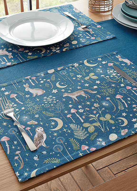 Create wonder and enchantment at your dining table with these folklore style placemats. Featuring beautifully illustrated foxes, owls, and rabbits, they add a touch of charm and whimsy to every meal. Made from easy care, durable 100% cotton fabric, these placemats are perfect for everyday dining or special occasions, bringing a magical touch to your table setting.Multi Pack: Pack of 4 with a choice of 2 designs for interchangeable stylingProtection: Protects the surface of the table from scratches, spills & stainsMachine washable, Line dry, Iron on low heat100% CottonSize approx. 30 x 46 cm each