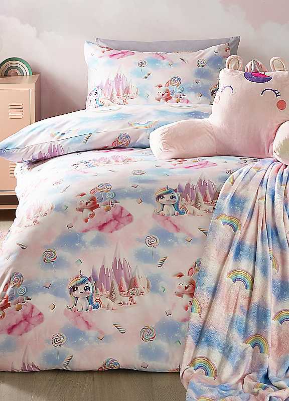 Wrap yourself in a magical dreamland with this candy unicorn blanket throw! Bursting with soft pastel hues, this enchanting design features majestic unicorns prancing among candy floss trees, swirling lollipops, and glowing rainbows, creating a whimsical, storybook inspired scene. Made from super soft polyester, this cosy throw is perfect for adding a touch of fairytale magic to your space while keeping you warm and snug.Machine washable, Tumble dry100% PolyesterSize approx. 130 x 170 cm