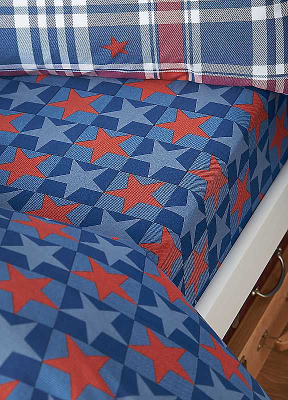 Add a bold base to your bed with this fun fitted sheet, featuring a striking all-over star print in deep navy and brick red. Created from easy-care recycled polyester and soft cotton, blended for everyday use.Catherine Lansfield is renowned for style and quality - designed and developed in Great Britain.Made to quality and human-ecological safety standards, in accordance with Made In Green by OEKO-TEX®.Durability: Made to withstand regular use & washingFully Elasticated: Creating a secure hold around your mattress25cm Depth: Suitable for a standard depth mattressesSuitable for machine washing & tumble drying52% Recycled Polyester, 48% Soft Cotton