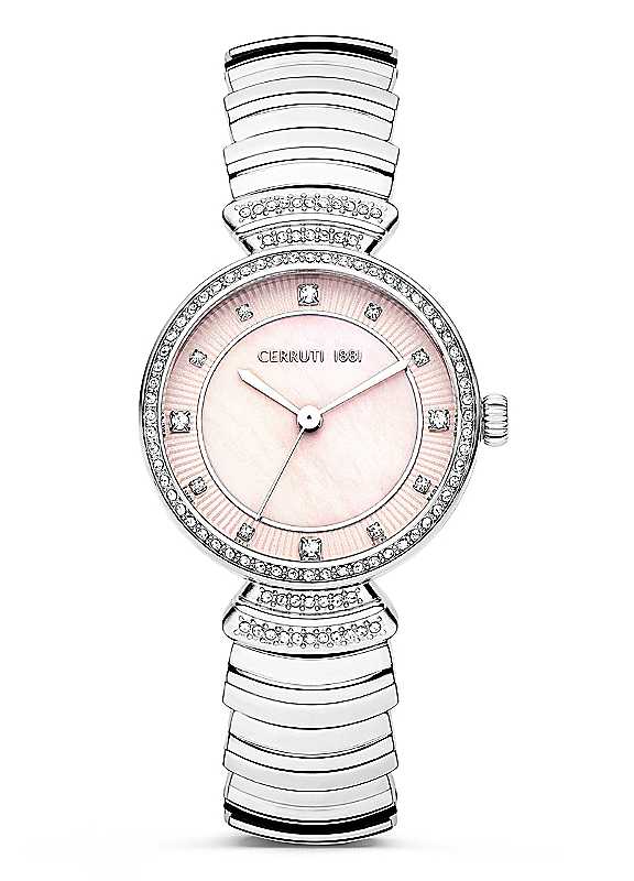 Cerruti Silver Bracelet Watch with Pink Mother of Pearl Dial.Brand: CerrutiMovement: 2035Material: Stainless SteelCase: Polished, Stainless SteelTop Ring Plating: Stainless SteelCrown & Pusher Plating: Stainless SteelDial: Pink 3035C Mother of Pearl/Stainless Steel & Stones IndexesGlass: FlatStrap: Stainless Steel Metal band (Stainless Steel Butterfly buckle)WR: 5 ATMStones: YesStainless SteelCase size approx. 30 mm | stainless steel analog watch, silver analog watch, metal analog watch