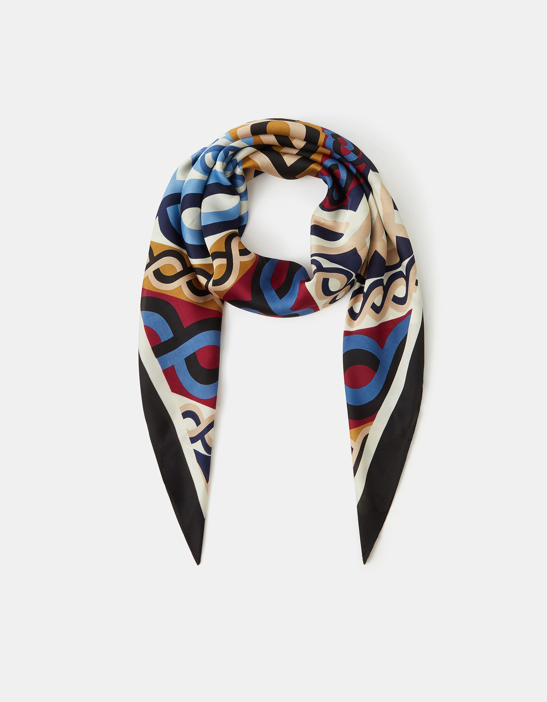 A fun way to add a pop of colour into all your 'fits, this small square scarf is made from a soft satin fabric with a chain print in bold hues.