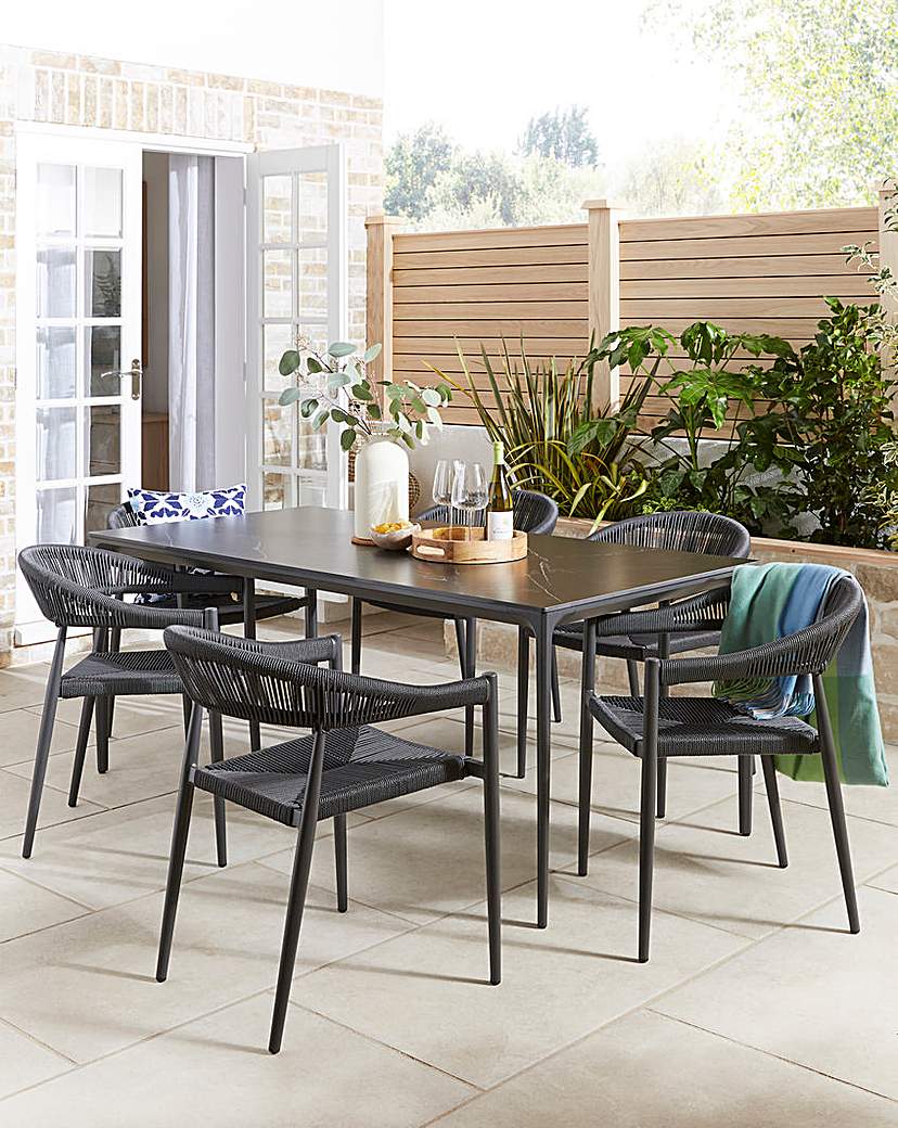 Sicily Sintered Stone 6 Seater Dining Set features: Sinterstone tabletop. Stacking chairs. Approx 30 minutes assembly time. 12 Month manufacturers warranty. Requires 2 people for assembly.