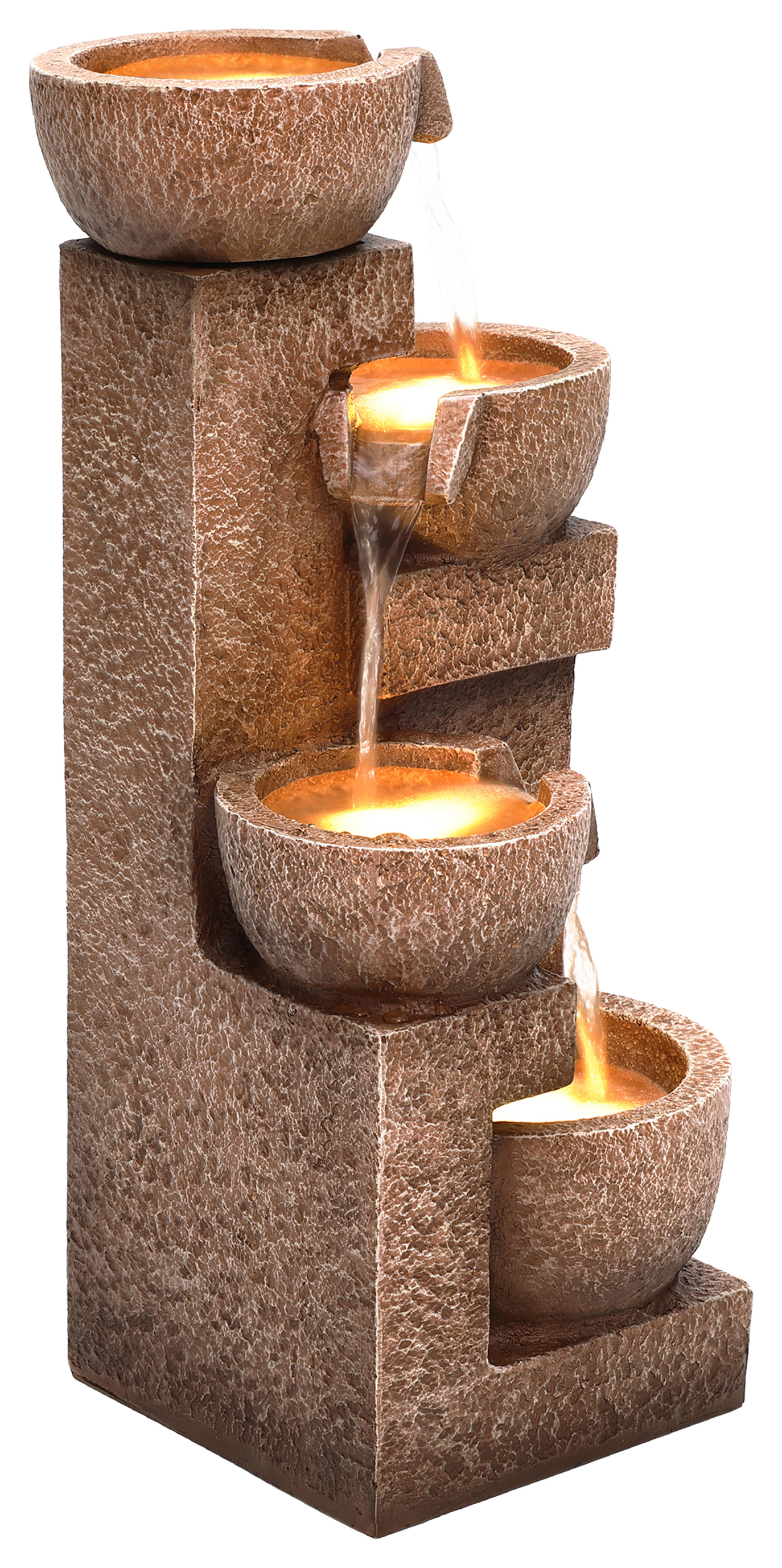Charles Bentley Danube Water Feature - Transform your garden or patio with the stunning Danube Four Tier Water Feature, designed with four cascading bowls that create a calming flow of water and gentle, soothing sounds. Built-in LED lights softly illuminate the water stream, bringing a tranquil glow to your outdoor space from dusk through evening, perfect for masking urban noise and creating a peaceful retreat. Crafted from durable polyresin with a natural stone effect finish that brings elegance to both traditional and contemporary garden styles. Its weatherproof, frost-resistant construction and UV-resistant finish ensure this water feature withstands the elements throughout the seasons. Mains powered with simple installation, just position on a flat surface, fill with water, and plug into a standard UK socket using the 5-metre cable. At 54.5cm tall, this feature creates visual impact without overwhelming smaller spaces.