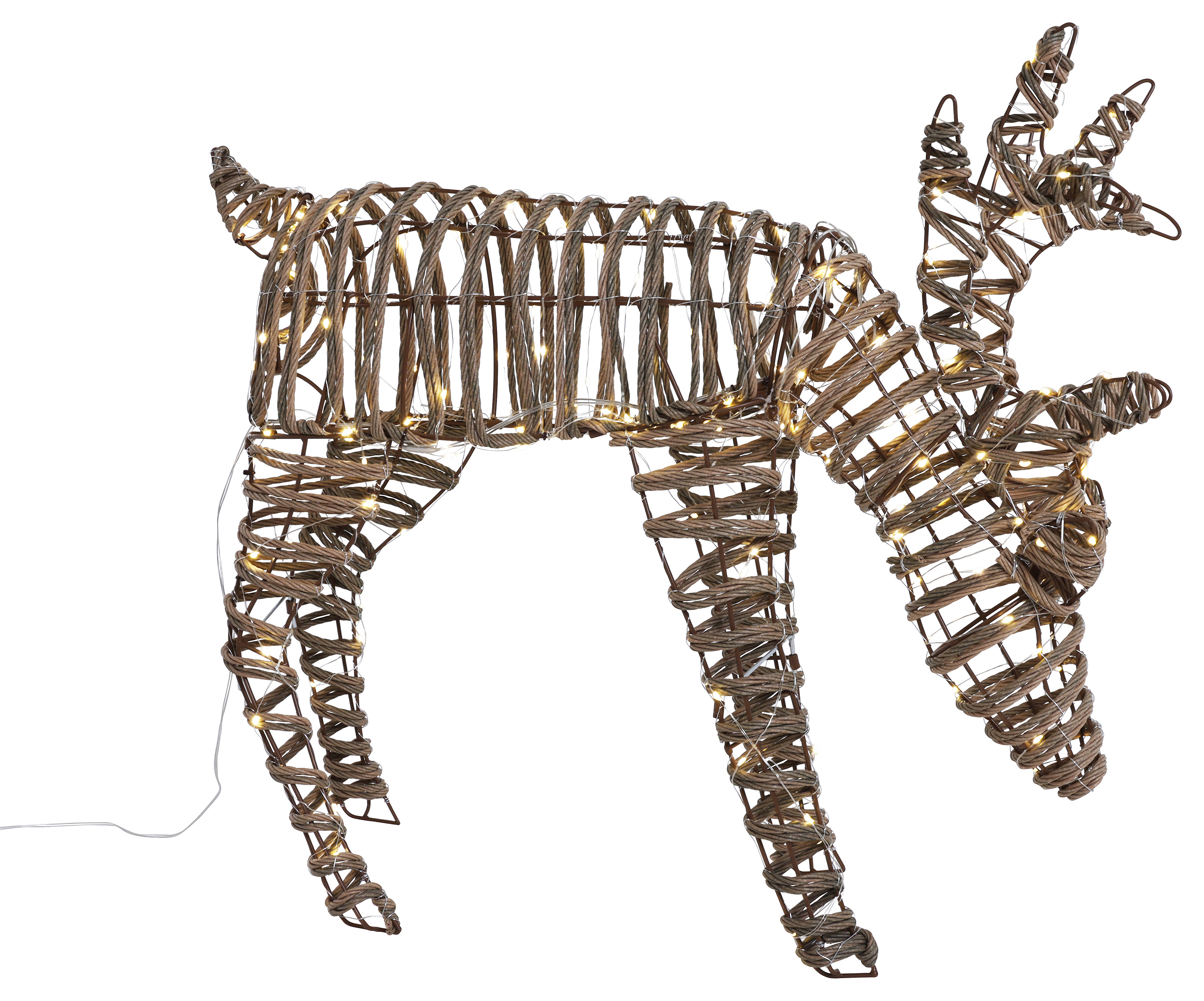 Charles Bentley Small Rattan Light Up Reindeer - Add a festive sparkle to your home or garden with our small light up Reindeer, a charming addition to your Christmas display that brings warmth and magic to any setting. Crafted from natural-look rattan woven around a brown metal frame, this elegant deer is wrapped in glowing white Micro LED lights, creating a beautifully soft, seasonal glow. Designed for ease and practicality, the reindeer features a built-in timer (8 hours on, 16 hours off), so you can enjoy coming home to a beautifully lit entrance way with no need to switch on or off all season long. It's suitable for both indoor and outdoor use, and comes supplied with miniature cable ties and ground pegs for added stability in your garden. The reindeer can be disassembled if required for stress-free storage. Whether standing proudly on your lawn or adding a whimsical touch indoors, this elegant deer is the perfect way to light up the season.