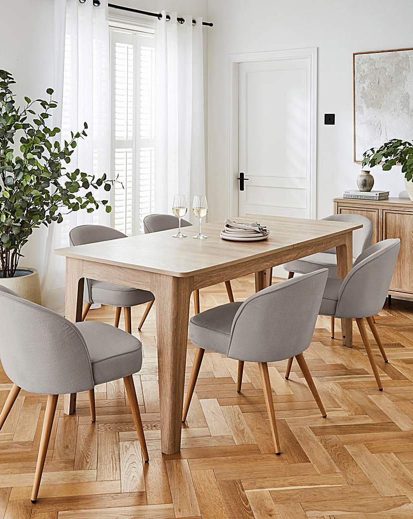 This package includes, the Emilie pair of dining chairs have tapered metal legs finished with a wooden effect. And the Charlotte Dining table, finished in a washed oak effect and sits 6-8 people with its extendable function. Self assembly required.