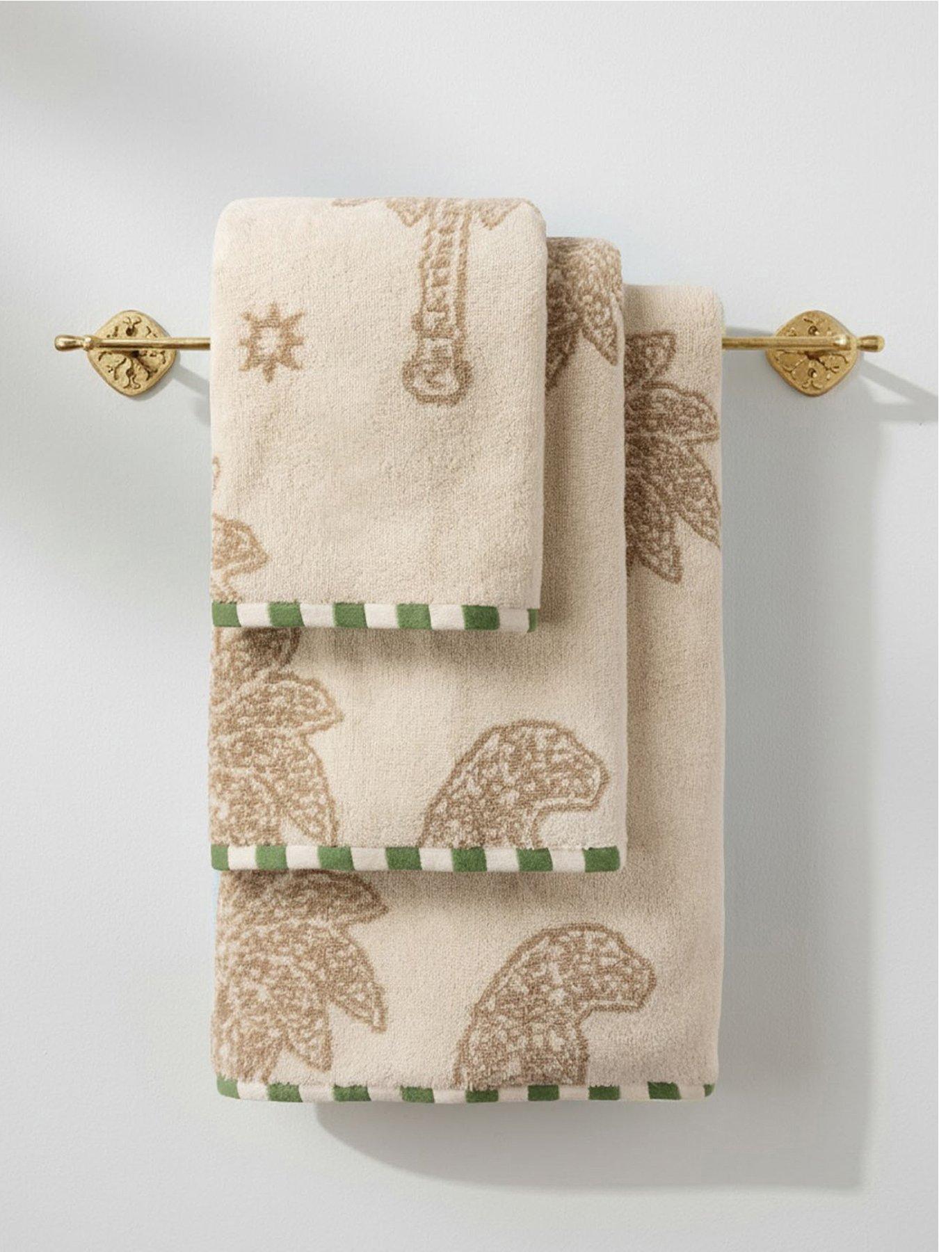 CHELSEA PEERS Cotton Midnight Leopard Print Taupe Towel Collection Wrap yourself in playful sophistication with our Midnight Leopard Print Towel - Taupe. One side features a taupe backdrop adorned with cream embroidered illustrations of moons, stars, palm trees, and our iconic Chelsea Peers leopards, evoking an elegant dreamscape. Flip it over to reveal the inverted palette for a striking, refined contrast. Finished with green and white striped edging for a pop of colour and contemporary accent. Crafted from soft, absorbent 100% cotton, this towel blends practicality with elevated charm, bringing a touch of luxury to your everyday routine. Material Content: 100% Cotton Washing Instructions: Machine Washable
