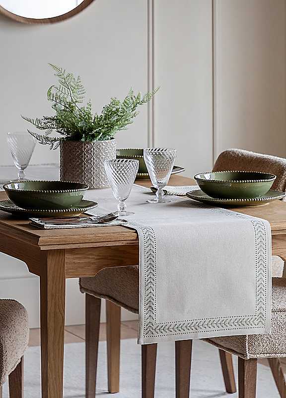 Beautifully subtle style for your table, with natural cotton fabric for a high quality look and material guaranteed to last, offset by delicate graphic printed leaf pattern. The table runner is a large size and has a high quality feel, perfect for practical use and sophisticated style, this table addition is great for entertaining.Machine washable at 30°CLine dryIron on low heat100% CottonSize approx. 36 x 180 cmWe recommend that Rugs should be used in conjunction with the 'Rug Grip Hold' when placed on smooth surfaces.