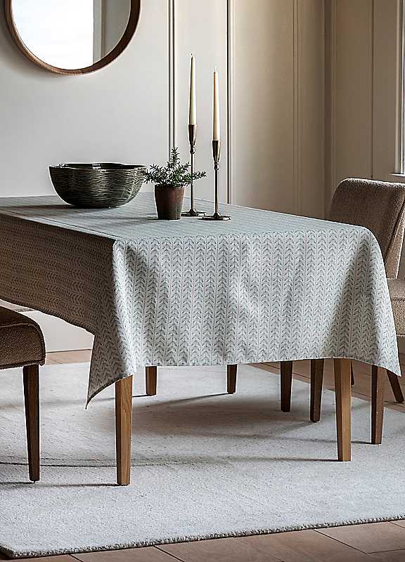 Beautifully subtle style for your table, with a clever wipe clean fabric finish for a high quality look and material guaranteed to last, offset by delicate graphic printed leaf pattern. The table cloth's wipe clean finish makes it perfect for practical use and sophisticated style, this table addition is great for entertaining.Machine washable at 30°CLine dryIron on low heat100% PolyesterSize approx. 140 x 230 cm