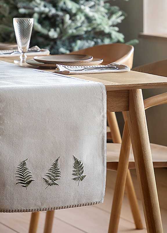 Bring together all the elements of a cosy family meal with this charming table runner. In soft cream and brown tones and blanket stitch trim, beautifully embroidered fern leaves add the finishing touch.Iron on low heat100% CottonSize approx. 36 x 180 cm