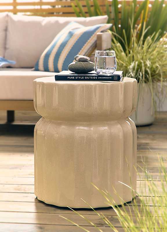 Add a touch of funky and modern style to your outdoor space with this beautiful side table. The solid funky shape and pop of deep colour create a truly unique but very fashionable look that is bound to get guests talking when you entertain during the summer months. The scalloped edge and all-in-one look create a stunning design feature. Also designed to be used inside, transport the side table around to use in your conservatory when you feel the nights getting chillier. Also available in a trendy green and airy cream colourway.Ready AssembledWeight approx. 24 kgWeight capacity approx. 50 kgWipe clean onlyAssembled dimensions approx. 45H x 40W x 40D cmPlease Note: To extend the product life and appearance, we strongly advise using a protective furniture cover during Autumn and Winter months and during adverse weather conditions. | outdoor ceramic side table, funky side table, outdoor side table with storage, contemporary outdoor furniture, shabby chic side table, cool outdoor furniture, colorful side table, stylish outdoor furniture