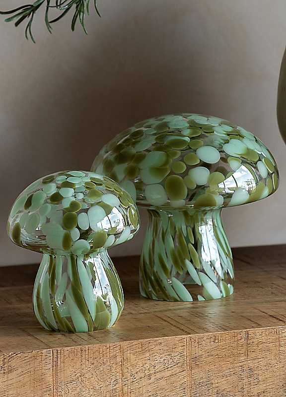 Add Autumnal charm to any interior with this pair of glass mushrooms. Handblown in forest green glass, each mushroom has a unique confetti pattern, adding a handcrafted touch.Set of 2100% GlassDimensions approx. 17 x 17 x 17 cm