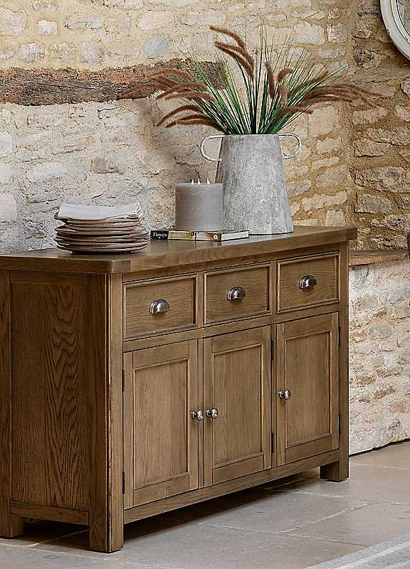 Discover ultimate storage with this generously sized sideboard. Featuring three spacious drawers and three cupboards, this sideboard offers exceptional storage for kitchens, living spaces and hallways. The warm wood finish of the solid oak & veneers is full of natural grain detail, perfectly complemented by classic metal handles, creating a blend of timeless style and substance.Weight of product: 44 kgWeight capacity: 190 kgClearance from floor 81.8 cmWall anchor kit providedReady AssembledWipe clean only, avoid household cleaners/abrasivesOak, Oak Veneer, Pine, MDFDimensions approx. 86H x 150W x 44D cmPlease remember to measure your available space before ordering. If using on an un-carpeted floor we recommend rubber or felt protection pads be used under the legs to avoid damage to your floors.