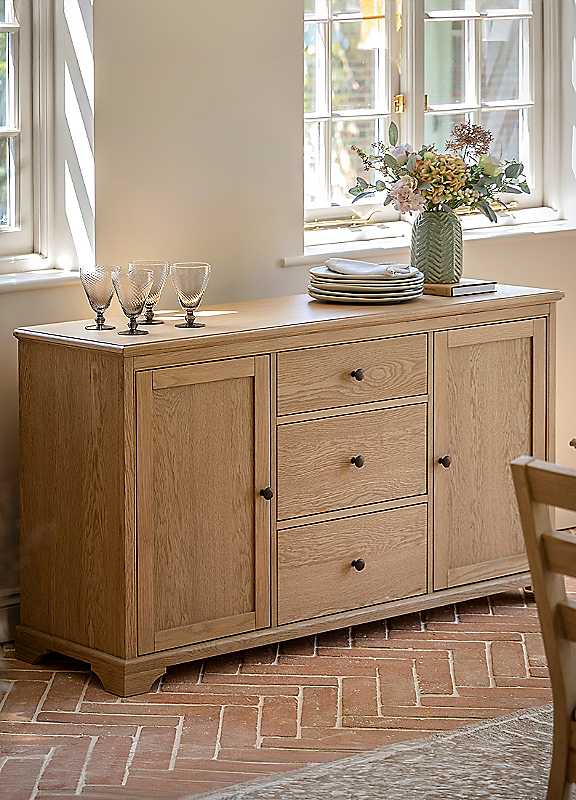 Combining timeless design with unparalleled practicality, this sideboard fits perfectly into a wide range of interiors, from traditional to contemporary , Its sideboard is a timeless addition to any space. Ideal for dining rooms, kitchens, or large living areas, the sideboard provides ample storage behind its two doors, alongside three convenient drawers for smaller items.The dark door knobs and drawer pulls perfectly complement the warm tones of the high quality solid oak & veneers, which is full of subtle grains and a warm, natural finish.Weight of product: 54 kgWeight capacity: 50 kgClearance from the floor 5 cmWall anchor kit providedMinimal AssemblySuggested number of people for assembly: 2Tool kit included: YesWipe clean only, avoid household cleaners/abrasivesOak, Rubberwood, Oak Veneer, MDFDimensions approx. 80H x 140W x 40D cmPlease remember to measure your available space before ordering. If using on an un-carpeted floor we recommend rubber or felt protection pads be used under the legs to avoid damage to your floors.