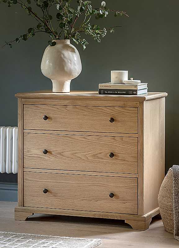 Discover practical elegance with this charming light wood chest of drawers. Crafted with premium solid oak and veneers with a warm natural finish, the chest showcase the natural beauty and grain of wood. The contrasting dark knobs add a classic touch, making this chest a timeless and functional addition to your bedroom, perfect for both traditional and contemporary room schemes. Featuring three spacious drawers providing ample storage.Weight of product: 37 kgWeight capacity: 50 kgClearance from floor 5 cmMinimal AssemblySuggested number of people for assembly: 2Wipe clean only, avoid household cleaners/abrasivesOak, Rubberwood, Oak Veneer, MDFOverall assembled dimensions approx. 76H x 82W x 44D cmPlease remember to measure your available space before ordering. If using on an un-carpeted floor we recommend rubber or felt protection pads be used under the legs to avoid damage to your floors.