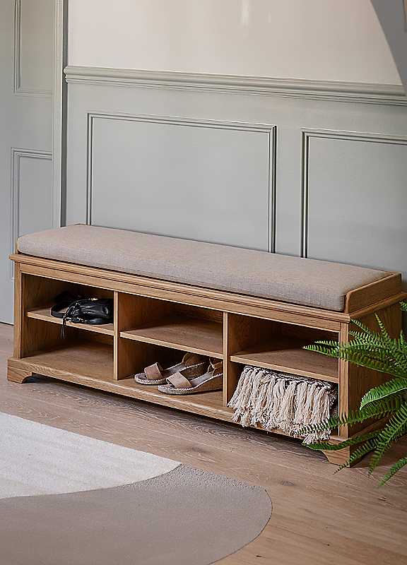 Welcome functionality and style into your home with this versatile hall bench. Perfect for your entryway, the bench features a comfy, natural toned upholstered cushion for seating and six open cubbies, ideal for organising shoes, bags, or other essentials. The wooden frame is crafted in solid oak & veneers, full of subtle grain detail and natural warmth, adding a touch of natural charm to any space.Weight of product: 26 kgWeight capacity: 240 kgClearance from floor - 5 cmReady AssembledWipe clean only, avoid household cleaners/abrasivesOak, Rubberwood, Oak Veneer, MDF, FabricOverall assembled dimensions approx. 51H x 140W x 38D cmPlease remember to measure your available space before ordering. If using on an un-carpeted floor we recommend rubber or felt protection pads be used under the legs to avoid damage to your floors.