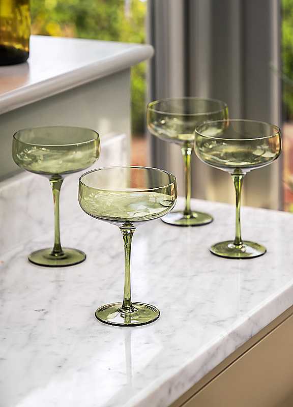 In Smokey green glass, this set of four coupe glasses allows anyone to sip a cocktail in style.Pack of 4Dishwasher safeNot freezer safeNot microwave safe100% GlassDimensions approx. 15 x 11.3 x 11.3 cm