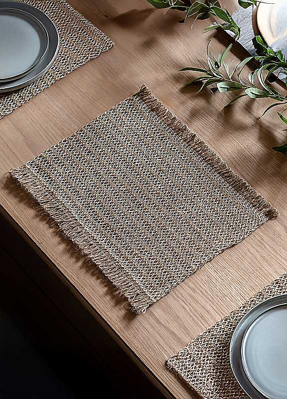 Natural weave rectangle placemats in a pack of 4. These placemats are large and practical whilst also remaining stylish and modern. The white thread interwoven in the striped pattern creates detail and a pop of contrast, whilst the fringe edged adds elegance once more. The jute material is an attractive texture but also long lasting and easy to clean.Pack of 4Spot clean only50% Paper, 50% JuteSize approx. 35 x 45 cm