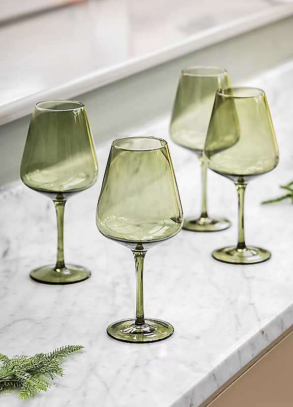 In Smokey green glass, this elegant set of four wine glasses features slender stems and angled bowls, creating a sophisticated glass perfect for enjoying a glass of wine in style.Pack of 4Dishwasher safeNot freezer safeNot microwave safe100% GlassDimensions approx. 21 x 9.4 x 9.4 cm