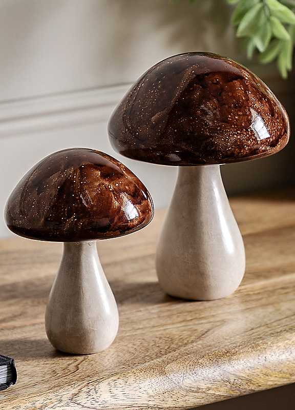 This set of two glazed ceramic mushroom objet will add an autumnal touch to any interior.50% Resin, 50% Wollastonite Dimensions approx. 21 x 15 x 15 cm