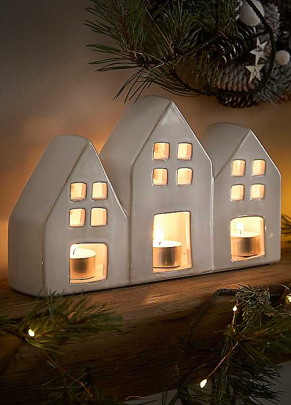 This pretty tealight holder is a unique, clever and whimsical design, creating the look of warm and cosy homes along the street this Christmas season as the candle flame glows through the windows of its lovely house shape. The white ceramic material and design of the houses, right down to the windows creates a handmade feel. The design is a subtle but festive look for the Christmas season, guaranteed to work with a variety of home decor. This tealight holder also comes in smaller size, including only one house, to complete the look in your home.Candles not includedDimensions approx. 16 x 26 x 6 cm | white candle holder, handmade candle holders, christmas candle holder, decorative tealight holder, christmas house decorations, christmas decorations, ceramic tealight house