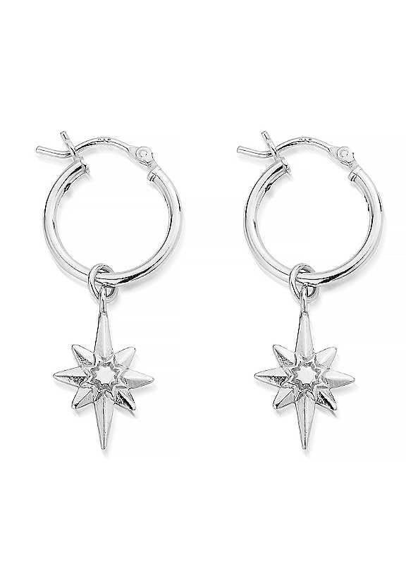 A symbol of hope and guidance, wear these statement earrings as a reminder to stay patient and trust your journey through life. Wear these hoops alone or amongst your ChloBo ear stack for another layer of meaning. Diameter is approximately 18mm, with a hinge and clip fasten for a comfortable fit.Brand: ChloBoSterling silver 925 | sterling silver hoops, sterling small hoops, silver hoop earrings, dangle hoop earrings, star hoop earrings, star shaped earrings, hinged hoop earrings, small silver earrings, delicate silver earrings, delicate hoop earrings, small hoop earrings, charm hoop earrings, tiny silver hoops, small silver hoops, sterling charm hoops