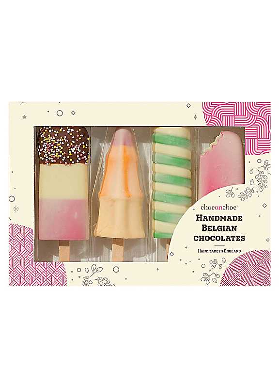 Choc on Choc Chocolate Ice Lollies Set 175g A delightful gift that reimagines classic British ice lollies in delicious Belgian chocolate. 4 Handcrafted chocolate lollies shaped like retro favourites - Fab, Rocket, Twister, and StrawberryMade from premium milk, white, and dark Belgian chocolatePresented in an eye-catching gift box. Dimensions approx. 20 x 12 x 3 cm For ingredients information click here