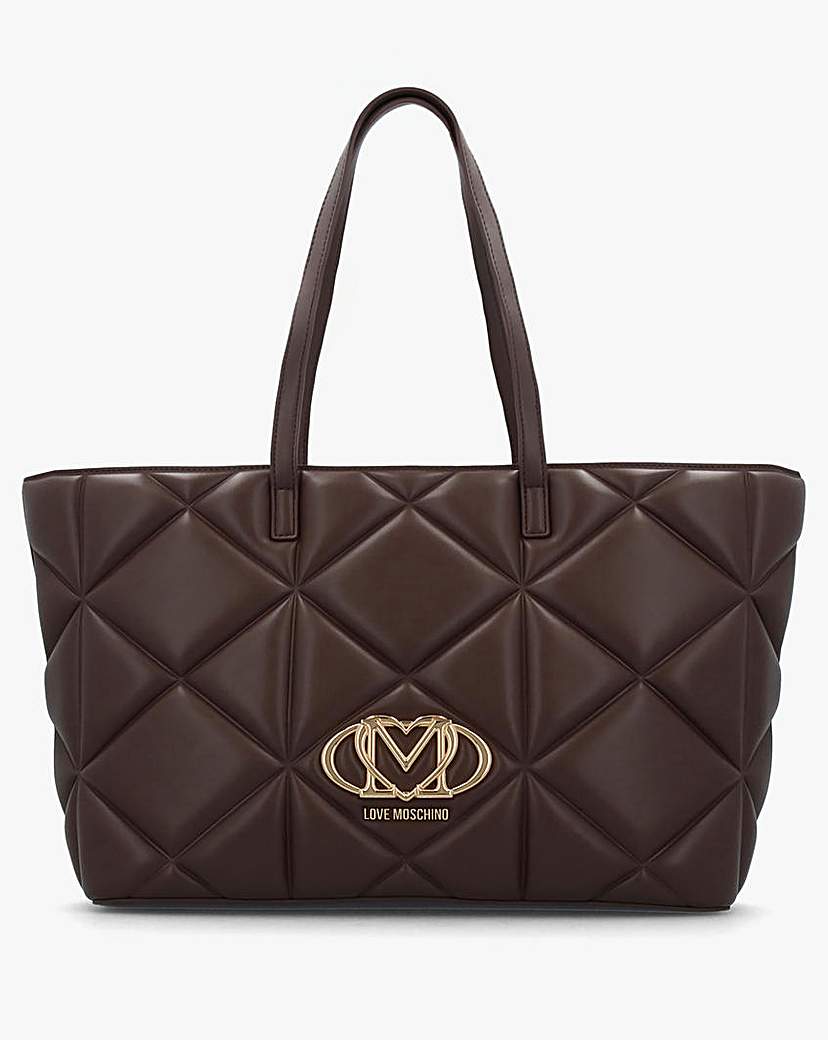 Love Moschino Heart Logo Quilted Pillow Chocolate Shopper Bag The Love Moschino Heart Logo Quilt Pillow Chocolate Shopper Bag is part of the New Season collection. Crafted from a premium faux leather in a quilted pillow design with polished gold tone accents. The secure top zip fastener allows access to the single main compartment with handy inner zip and slot pockets. Carry by the top handles. Statement heart logo motif adds detail to the front of the bag. Signature Love Moschino branding completes the design. Technical information: PU, Gold Tone Hardware, Quilted Pillow Design, Top Zip Fastening, Single Main Compartment, Inner Zip Fastening, Inner Slot Pocket, Top Handles, Heart Logo Motif, Love Moschino Branding, Includes Dust Bag Dimensions: Base L36, Top L49 x H29 x D14 CM
