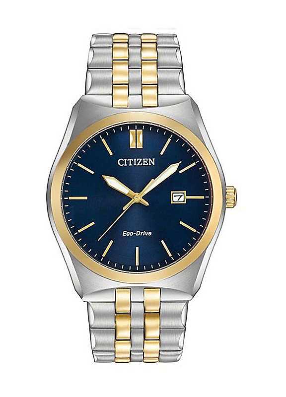 The byword is versality for this handsome 3-hand Citizen Corso watch crafted in two-tone stainless steel. Details include a sophisticated deep blue dial and a date window perfect for the every day businessman. Powered by light, any light. A watch that never needs a battery. Brand: Citizen No battery needed Stainless steel