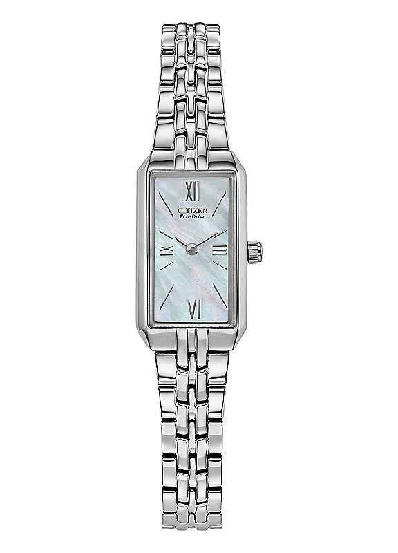 Citizen, a trusted name and brand leader in the watch industry for over 100 years, is known the world over for its uncompromising values: technical precision, innovative mindset, quality craftsmanship and design excellence. The first to create quartz crystal and titanium timepieces, Citizen was also an early pioneer in advocating for the, launching the first light-powered watches with proprietary Eco-Drive technology in 1976, thus adding eco-mindful as a core value. Perfectly complete any look with the elegance of this Silhouette from Citizen. With a stainless-steel 26mm case paired with a stainless-steel bracelet, this watch fits seamlessly on the wrist. The look is completed with a beautiful Mother-of-Pearl dial and silver-tone hands and markers. Additional features include water resistance and a jewellery clasp with push button release. powered by any light with Citizen Eco-Drive technology - never needs a battery.Brand: CitizenStainless Steel Silver Tone Bracelet with Jewellery ClaspStainless Steel Silver Tone CaseMother-of-Pearl Colour Dial26mm Case SizeMineral Crystal GlassWater Resistance: WR Splash ResistantFunctions: 2 Hand