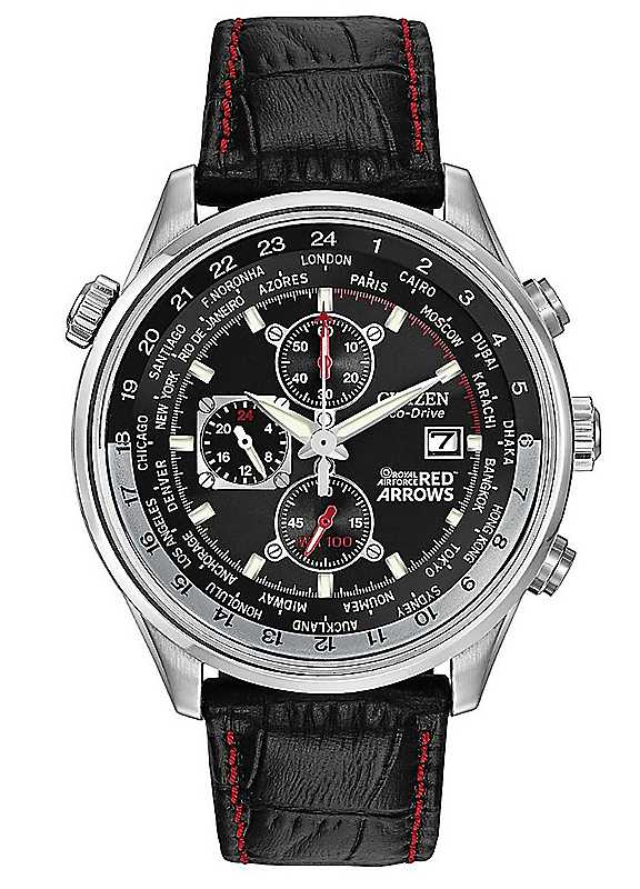 Take to the skies with this chronograph from the Citizen RAF Red Arrows Collection. Styled in stainless steel with a black dial featuring red and white accents. Features include a 1/5 second chronograph and 12/24-hour time. The official Red Arrows insignia appears on the watch case.Brand: CitizenWater resistance to 100 m, swimming, showering & snorkelingCitizen Eco-Drive technology is powered by light & never needs a battery60 Month Warranty PeriodCrystal glassCase size 45 mm | casual watches for men, black watches for men, black analog watch, black leather strap, water resistant watch, mens chronograph watches