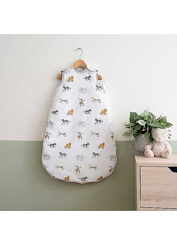 Give your new-born the gift of a comfortable and cosy sleep with the jungle dream sleeping bag. This 2.5 tog sleeping bag ensures your baby stays warm during night-time feeds, with an adorable jungle safari print that adds a playful touch to their nursery. Give your new-born the gift of a comfortable night's sleep with the jungle dream sleeping bag.Suitable from new-born to 6 months: Tailored for new-borns up to 6 months, this sleeping bag is crafted to cater to your baby's comfort and safety during those crucial early months2.5 tog rating for optimal warmth: with a 2.5 tog rating, this sleeping bag ensures your baby stays comfortably warm, providing a snug environment without the risk of overheatingNeutral jungle safari design: The on-trend jungle safari print featuring adorable safari animals, from lions to orang-utans, adds a playful touch to the nursery. Its neutral base colour seamlessly complements any nursery styleYear-round comfort: crafted from a cotton-rich fabric blend, this lightweight sleeping bag is soft and breathable, making it suitable for year-round useConvenient & practical design: Equipped with double poppers on the shoulders and a long side zip that opens out flat, this sleeping bag offers ease in getting your baby in and out. The design facilitates late-night nappy changes without entirely removing the sleeping bag, minimizing disruptions to your baby's sleepSuitable for babies 0-6 months - not suitable for babies less than 4kg/8.8lb. Maximum baby length 68cm / 27. Conforms to bs end 16781:2018Machine washable at 30°C60% Cotton, 40% PolyesterFilling: 100% PolyesterDimensions approx. 75 x 44 x 1.5 cm