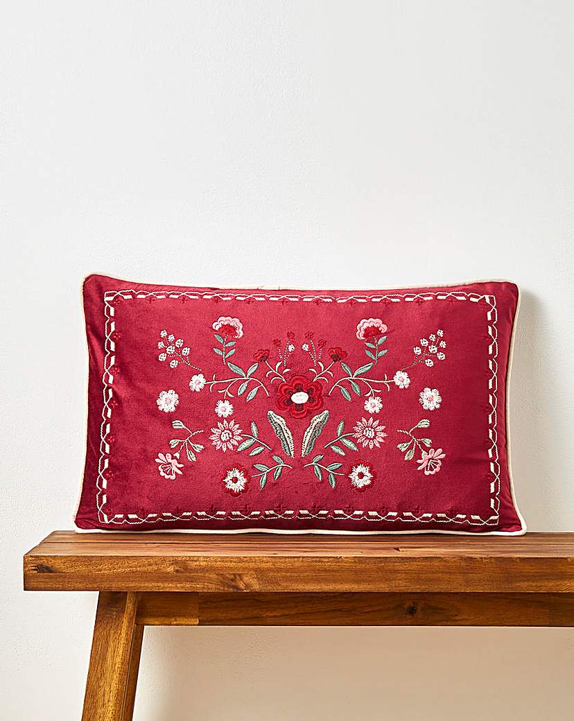 Floral embroidered cushion on a velvet base with piped edges.