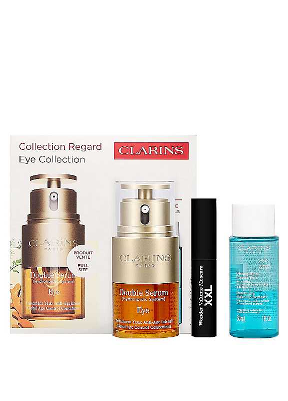 Set Contains: - Clarins Double Serum Eye 20ml - Clarins Mascara Wonder Volume xxl 3ml - Clarins Instant Eye Make-up Remover 30ml Clarins Double Serum Eye: Double serum eye is a 2-in-1 treatment for the eyes that revitalises the delicate eye area, infusing it with moisture and other nourishment for a more youthful appearance. In 7 days it forms to remove puffiness and dark circles whilst improving skin smoothness and firmness. Wild chervil strengthens the delicate skin around the eyes. Turmeric reduces the effects of ageing on the skin. Horse chestnut reduces skin puffiness. How to Use: Dispense into the hand before mixing. Apply to the eye area, gently pressing until absorbed. Clarins Mascara Wonder Volume xxl: Experience extreme lash volume with a 12-hour, smudge-proof hold. This mascara not only instantly amplifies your lashes but also works to make them longer, stronger, and revitalised. Clarins Instant Eye Make-up Remover: This eye make-up remover is perfect for heavy or waterproof make-up. It's gentle formulation is suitable for those with sensitive eyes and contact lens wearers. How to Use: Shake well before use. Apply to a cotton pad and place on a closed eye. Gently dab the cotton pad on the eyelid for 10 seconds before sweeping over the eyelashes, starting from the root and working down to tip. Do not rub.