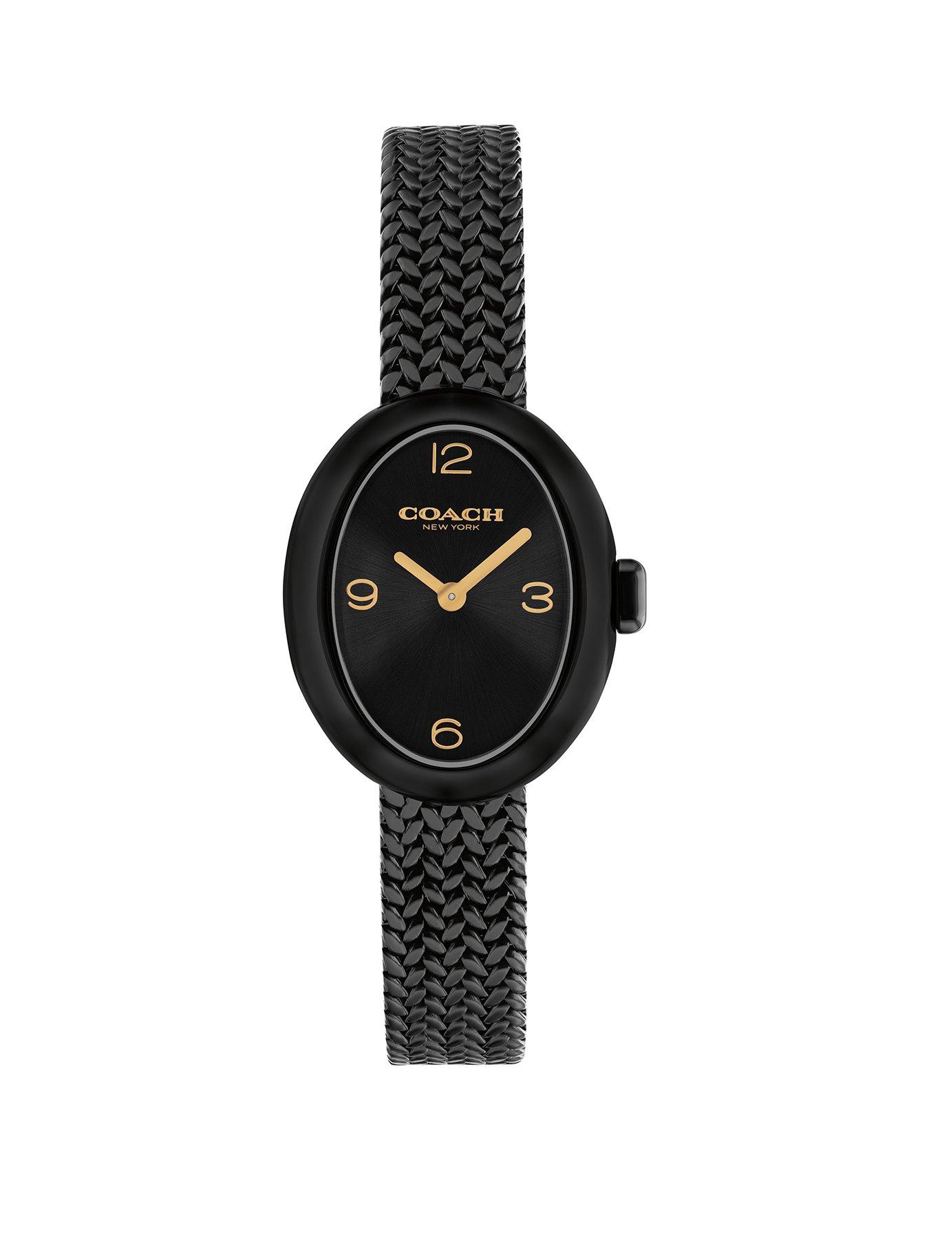 Coach Ladies Sammy Black IP Bracelet Watch Coach ladies 22mm black IP watch, black sunray dial with gold accents, black IP textured mesh bracelet. Water resistant to 3ATM 24Hr Display: N Case Diameter (in cm): 2.2 Case height (in cm): .8 Case Shape: Oval Fastening Type: Bracelet Glass: Mineral Movement: JapaneseQuartz(battery) Strap Material: Stainless Steel Water Resistant: Y