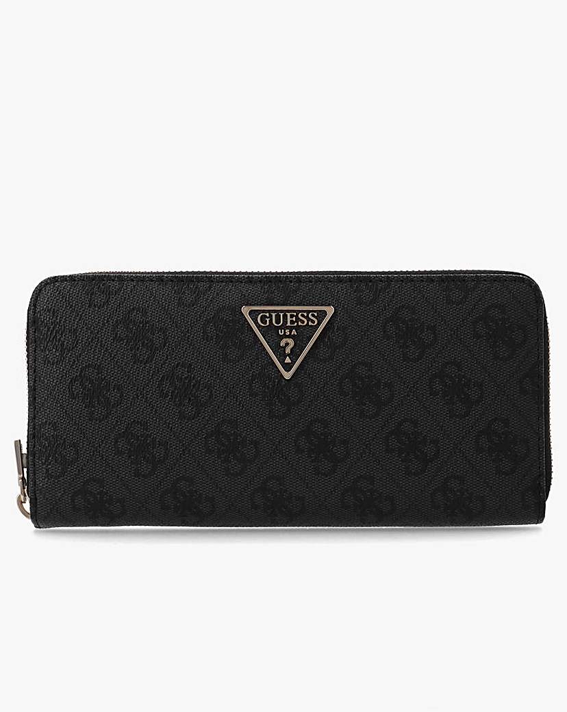 Guess Laurel II Large Coal Logo Zip Around Wallet Add the Guess Laurel II Large Coal Logo Zip Around Wallet to your accessories collection. This New Season versatile style in a textured design with polished gold tone accents. The secure zip around fastener allows access to multiple handy inner compartments, exterior zip pocket also features. Use it as a wallet or wear with the wristlet strap for an evening look. Iconic triangle logo motif adds detail. Signature Guess branding completes the design. Technical information: Textured Design, Gold Tone Hardware, Zip Around Fastening, Multiple Compartments, Exterior Zip Pocket, Detachable Wristlet Strap, Contains Recycled Plastic, Triangle Logo Motif, Guess Branding, Comes In Gift Box Dimensions: L20 x H10 x D2.5 CM