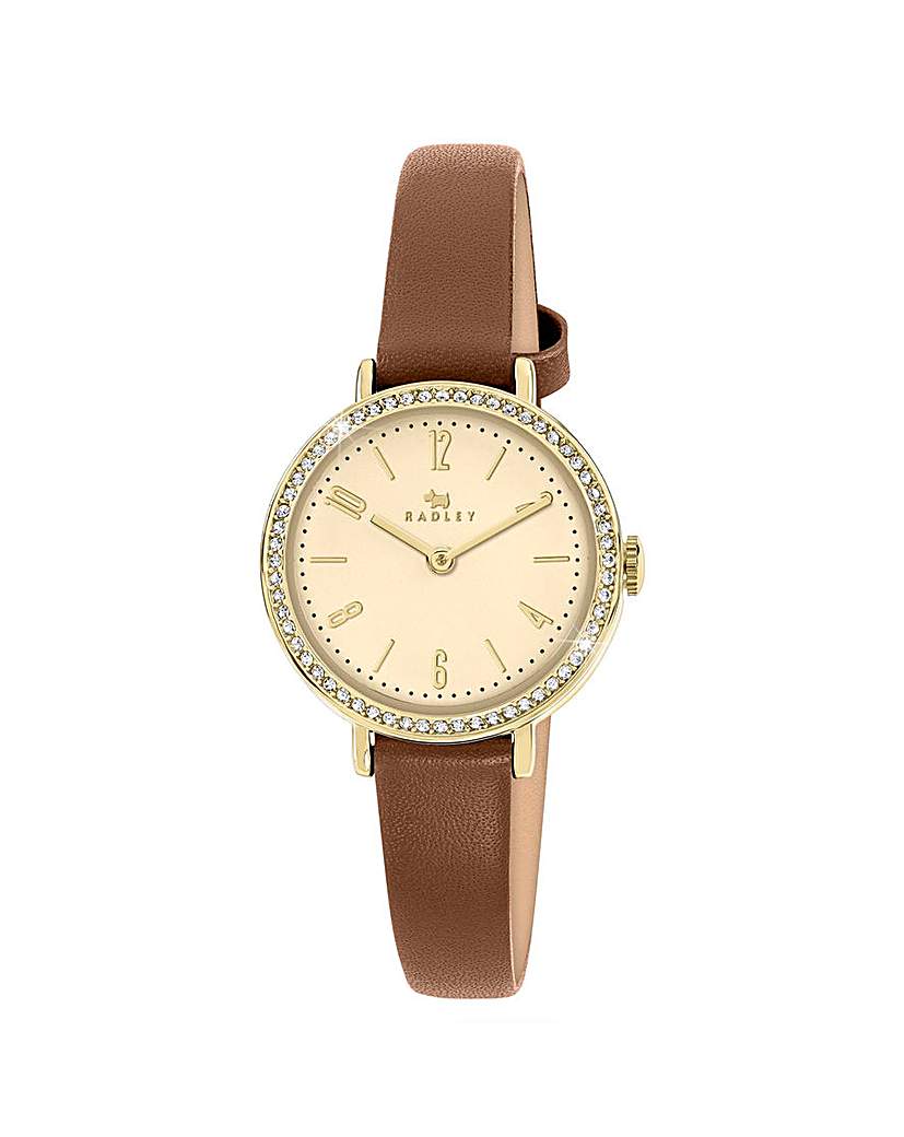 Radley Stone Set Cognac Leather Watch Radley Windsor Lane Stone Set Cognac Leather Strap Watch. Featuring a 26mm Czech stoneset case which showcases a soft champagne satin dial. The watch is finished with a soft Cognac genuine leather strap and fastened with polished gold buckle. Polished Pale Hamilton Gold Stone Set Case Presented in Official Radley Packaging Dimensions: 17.5 x 2.6 x 1