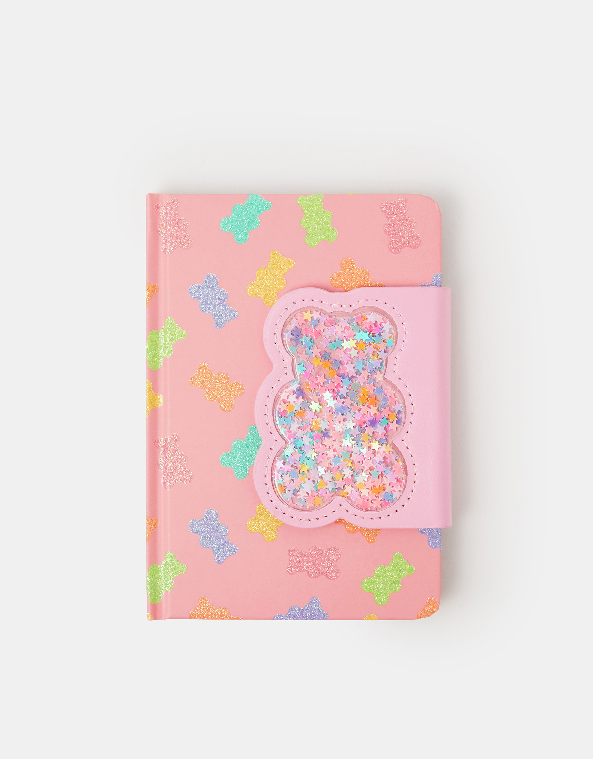 Patterned with colourful bear designs in a glitzy finish, this notebook is a sweet addition to their stationery collection. Filled with lined paper, it closes with a star confetti-filled bear tab.