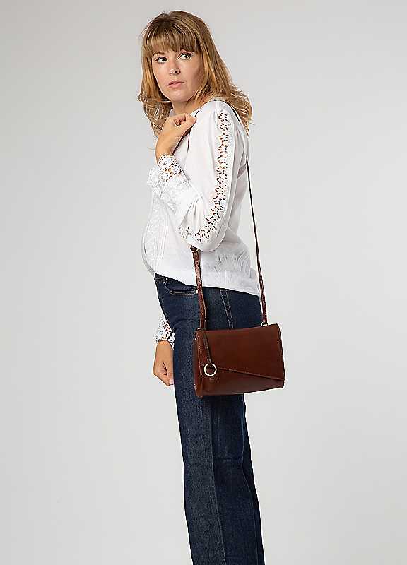 A unique angular fold over top of the 'Fallon' is secured with magnetic press stud fasteners in each corner and elevates this classic cross body design. The bag is crafted from multi-toned natural leather for an elegant finish. The trio of main compartment is secured under the fold-over top and include one zipped middle section with slip compartments on either side, providing ample space for your essentials. Additional storage space is provided by slip pockets, one on the interior and on the exterior to the back of the design, providing secure on-the-go storage. An adjustable slim leather strap with a maximum drop length of 68cm is complemented by the brass coloured metal fittings and zips. The minimalist Conkca charm and embossed logo adorns this style and adds a sophisticated touch.Outer: 100% LeatherLining: 100% CottonDimensions approx. 17H x 22W x 6.5D cm