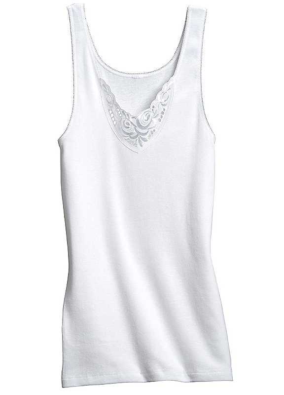 Pack of three, sleeveless vests in a lovely 'pure wear' fabric with different cambric lace motifs. Finished off in a fine ribbed design for added comfort. Brand: Conta Pack of 3 Sleeveless Boil proof Washable max. 95°C 100% Organic Cotton (Pure wear)