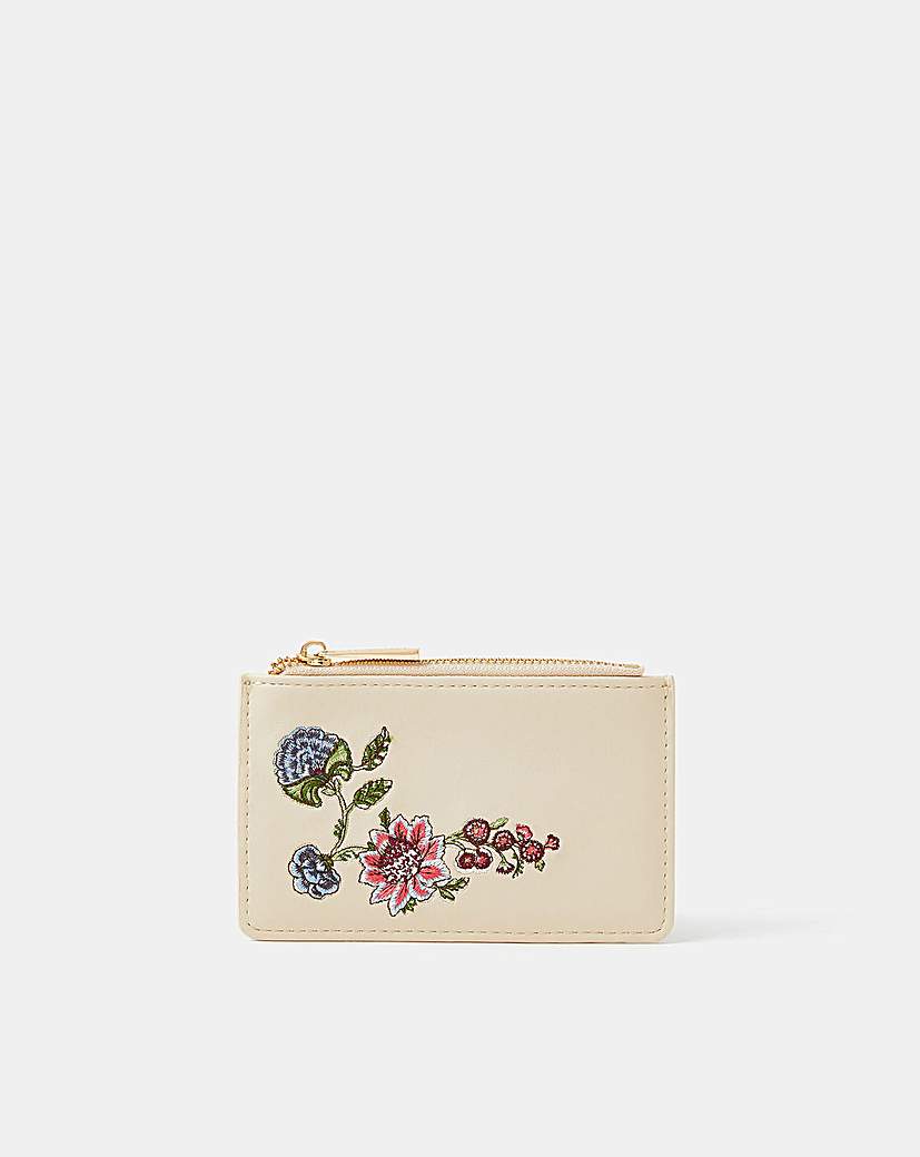 Accessorize Floral Embroidered Card Holder Stitched with bloomin' lovely florals over the faux leather backdrop, this cardholder is a cute addition to your daily essentials. It features a top zip compartment and four card slots on the back. Outer: Polyurethane (Pu) 100% Lining: Polyester (Recycled) 100%