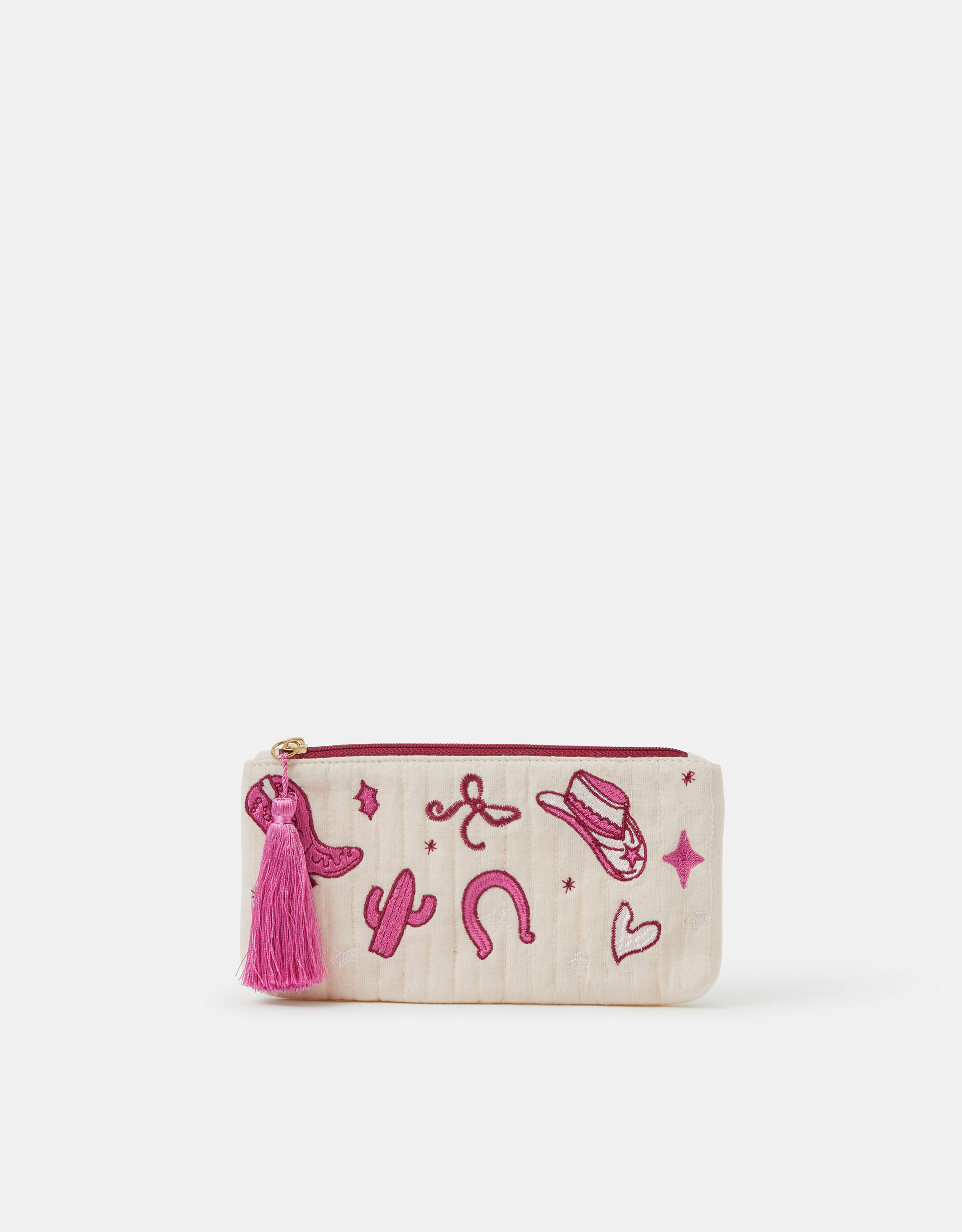 Howdy partner! Embroidered with hot pink cowboy motifs, this quilted pencil case is just the thing you've been looking for. Sure to be the talk of the classroom, it's finished with a matching tassel on the zip.