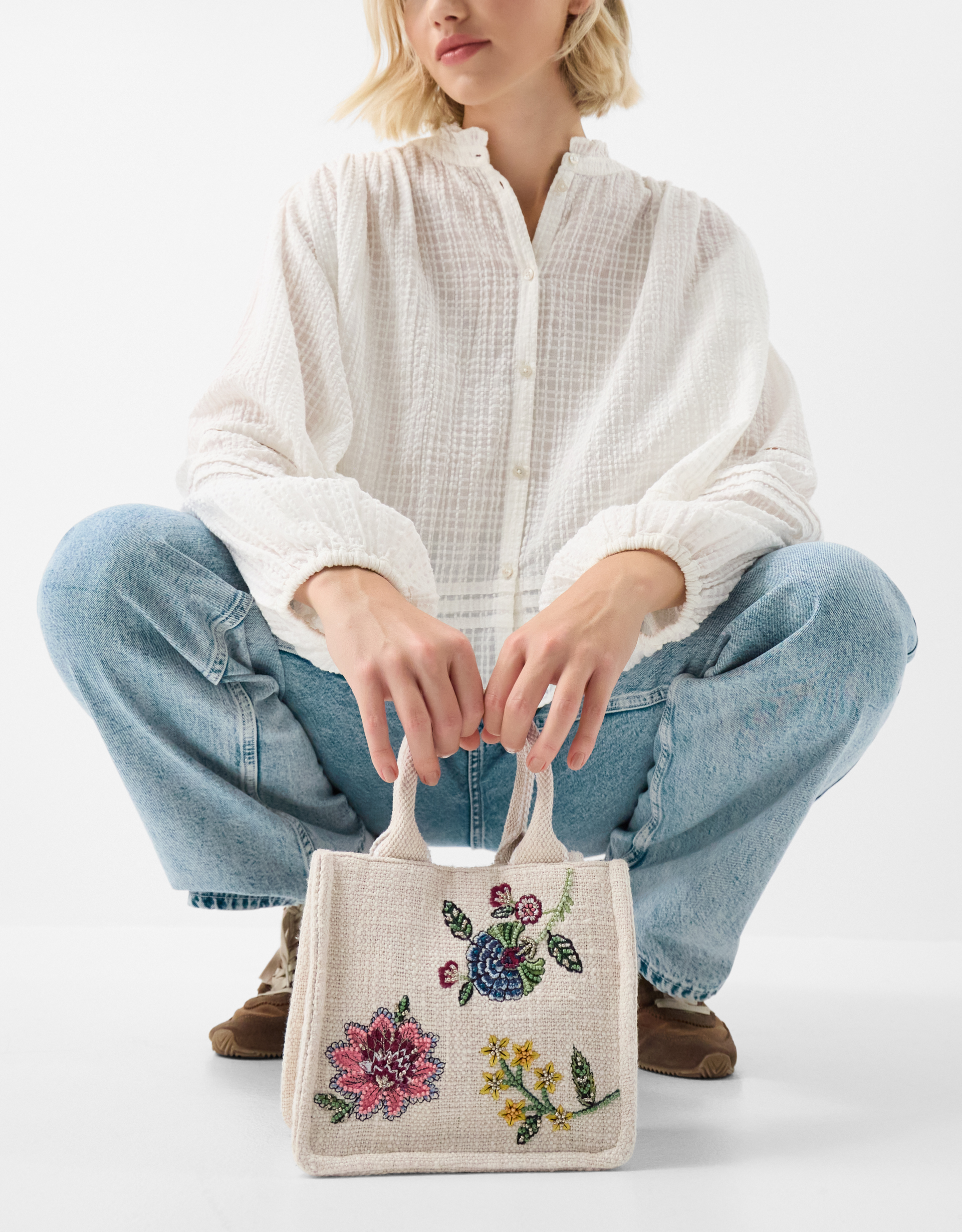 Ensure every quick trip to the shops is done in style...Designed with woven cotton, this miniature handbag is decorated with colourful embroidered flowers and sparkly bead embellishments. Features include two top handles, a detachable crossbody strap, inside slip pocket and magnetic button fastening.