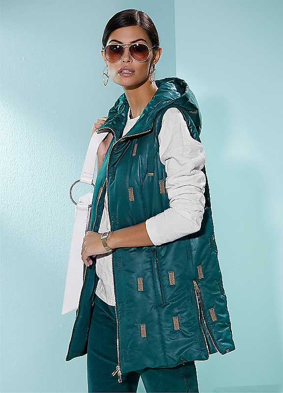 Eye-catching long gilet with a warm hood that can be adjusted using a tie fastening. Featuring exclusive quilting with 2-tone decorative seams, a 2-way zip and 2 welt pockets with zips. Zips on the side seams provide ease of movement while Viennese seams provide a perfect fit. Elasticated piping on the armholes.Brand: Creation L2-Way zip fasteningHoodedMachine washable100% PolyesterLining: 100% PolyesterLength approx. 78 cmPlease Note: European sizing tends to run smaller than UK. We suggest sizing up for the perfect fit!