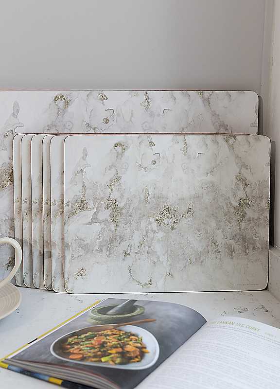 Protect your table with this fantastic set of six cork-backed placemats, which feature a stunning, pale grey, marble-effect print. Darker, earthy shades of grey smudge across the print, creating a natural, mineral effect. There are six table mats included: ideal for dinner parties and wine and cheese tasting with friends, or simply for brightening up every day dining after a dreary day. Simple, but beautiful, they'll blend in easily on the family dinner table, beneath dinner plates brimming with exquisite, home-cooked food. Combine your set of six table mats with the coordinating, larger set of four, measuring 40 x 29 cm (15½ x 11½ inches) (5234292), or the coasters (5234294). Why not treat your own table, or give them as a gift? They would make a lovely present for housewarming or wedding parties.Wipe clean onlyWood - MDF2.2 x 22.7 x 29.9cm
